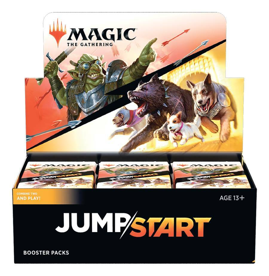 Jumpstart is a new way to play Magic that mashes together themes from throughout the history of the game and lets you skip the deckbuilding part. At its foundation, Jumpstart is simple. Grab two boosters, shuffle them together, and you’re ready to go!
