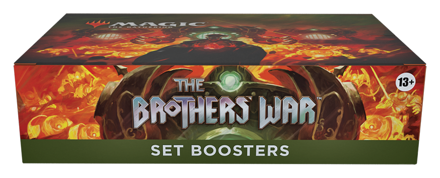 Ein Krieg der Brüder Set-Booster-Display enthält 30 Krieg der Brüder Set-Booster. Jeder Set-Booster enthält 12 Magic-Karten, 1 Artwork-Karte und 1 Spielstein-/Werbekarte oder Karte aus „der Liste“ (eine besondere Karte aus der Geschichte von Magic – in 25 % der Booster).
