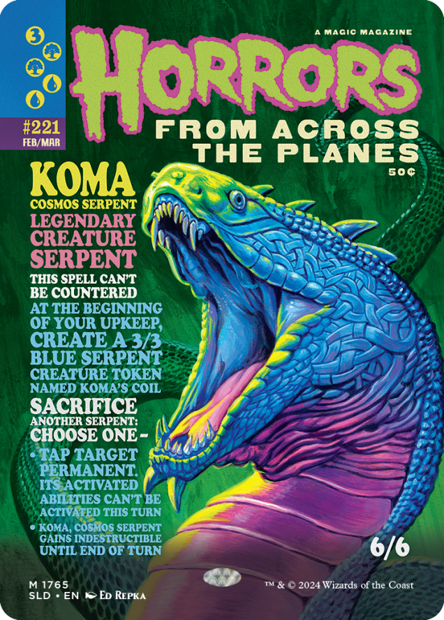 * It’s no secret that the haunted halls of Duskmourn™ can change you, but this particular change wasn’t by design. The card Koma, Cosmos Serpent, in the Monstrous Magazines drop, has a misprint, replacing “each upkeep” with “your upkeep.” The Oracle text rules remain accurate. Please enjoy a €5 discount on this drop—it’s on the House.