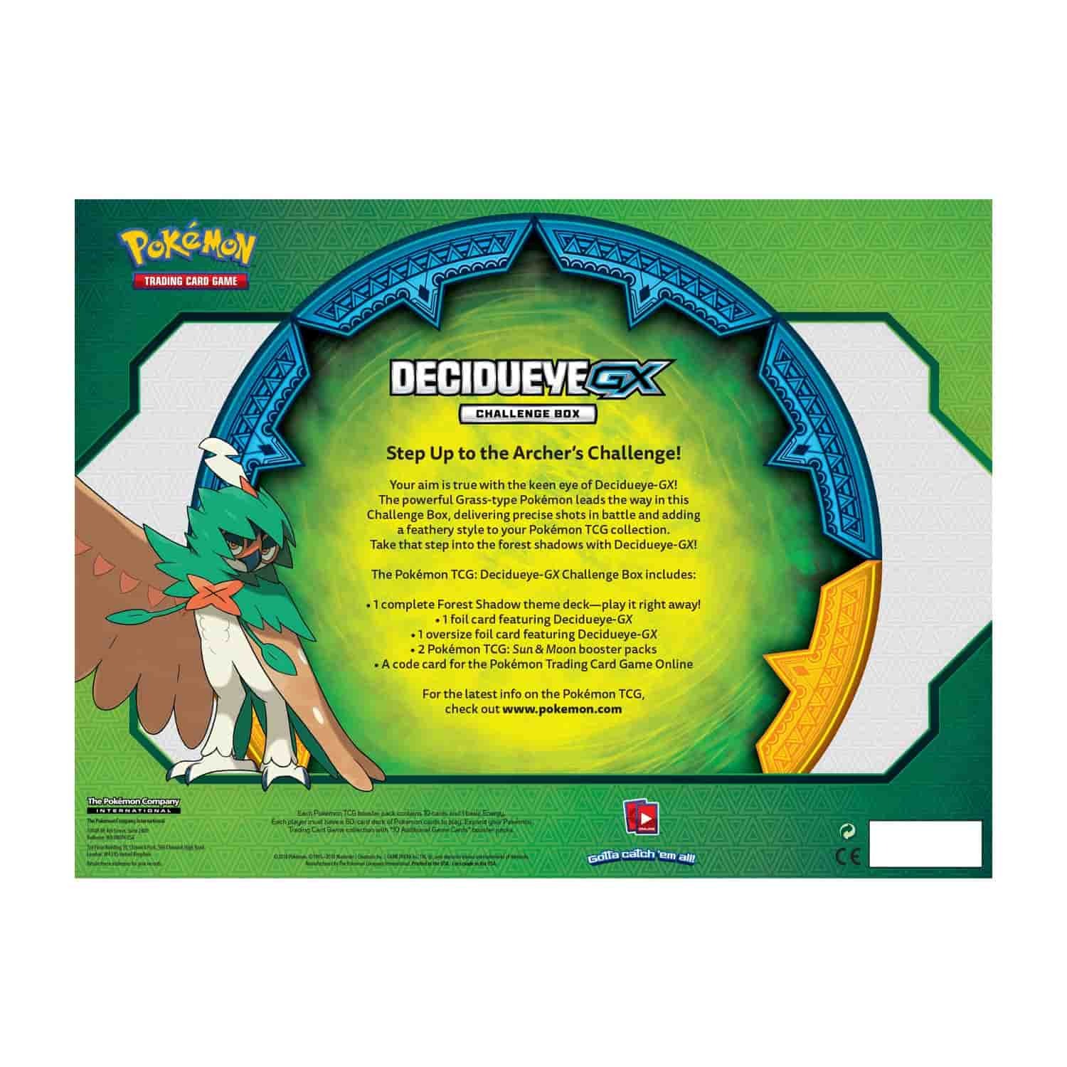 Your aim is true with the keen eye of Decidueye-GX! The powerful Grass-type Pokémon leads the way in this Challenge Box, delivering precise shots in battle and adding a feathery style to your Pokémon TCG collection. Take that step into the forest shadows with Decidueye-GX!